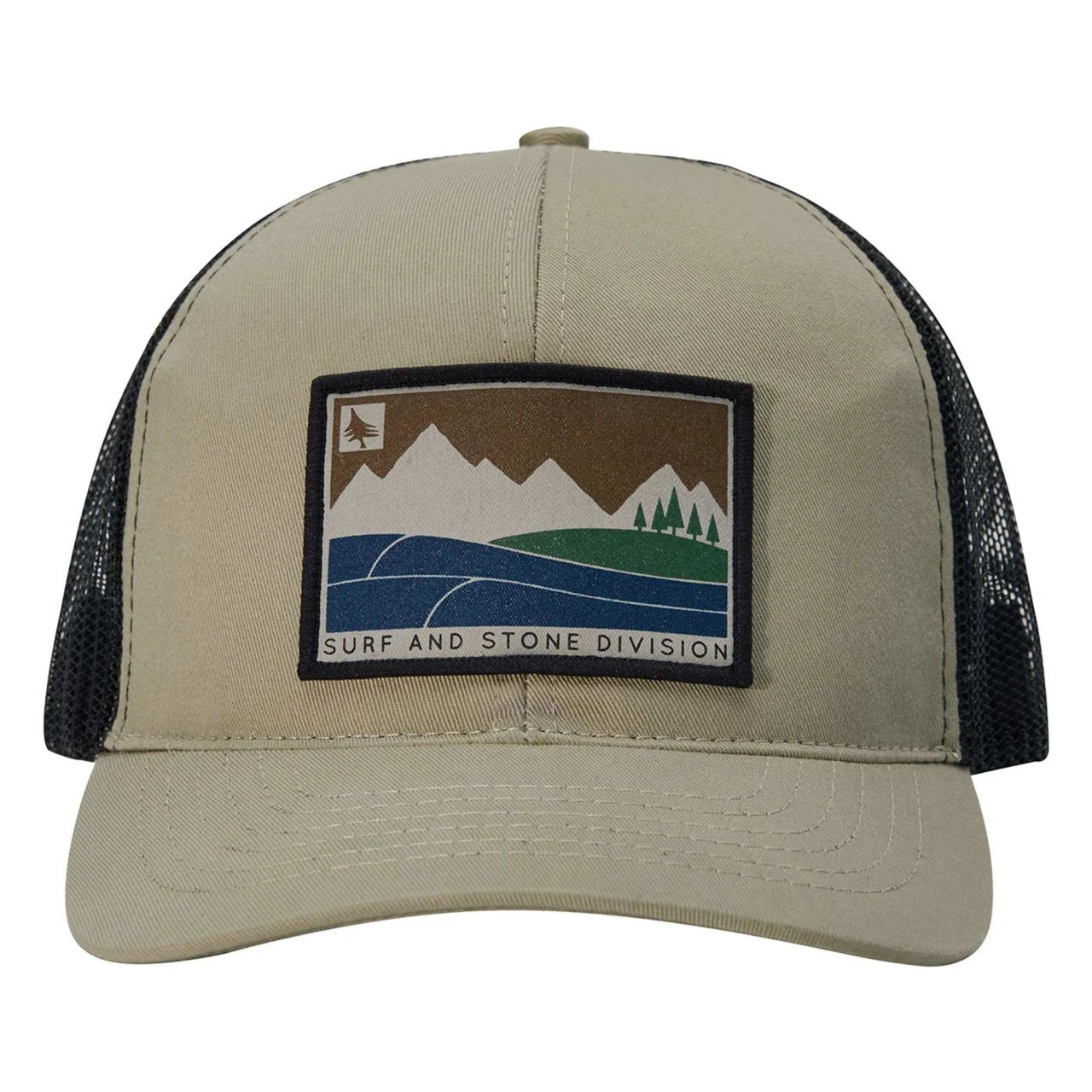 Vorne aufgenäht ist ein bedruckter Stofflicken mit „Surf and Stone“-Design